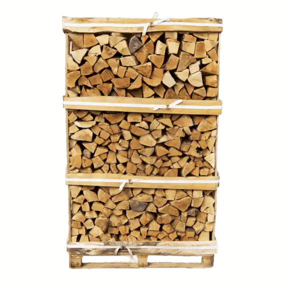 In Einwegpaletten gestapelt. Die Einwegpaletten können Sie auch zu Anzündholz verarbeiten.