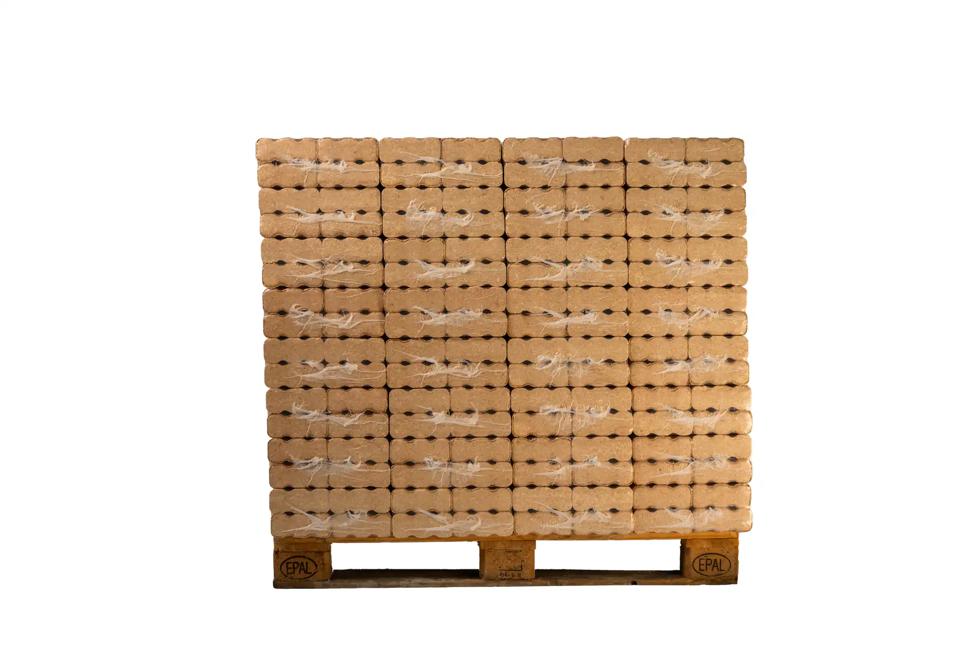 Auf einer Palette mit 960 kg befinden sich 96 Pakete a’ 10 kg mit 12 Briketts pro Paket mit Schrumpffolie verschweißt.
